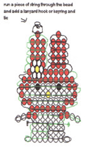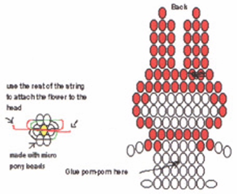 Special Instructions: With both strings of the flower, weave it through the 2 red beads indicated; come out through the back of the head and just tie off. Glue the white pom-pom on the back of My Melody as a tail.