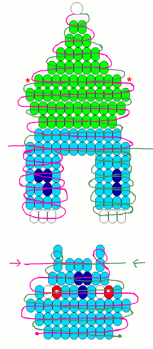 Do bulb piece first, don't cut excess cord. Feed cord for face piece through row of beads marked with stars. Do face. Take excess cord from bulb piece and feed through bottom row of face to link pieces.