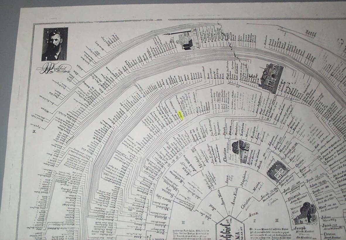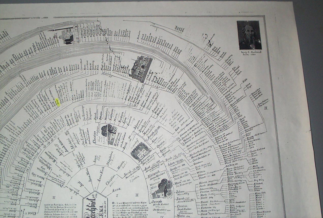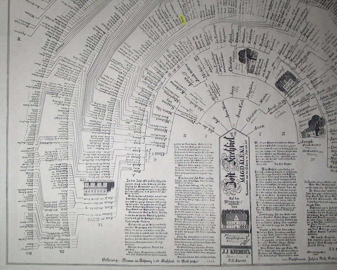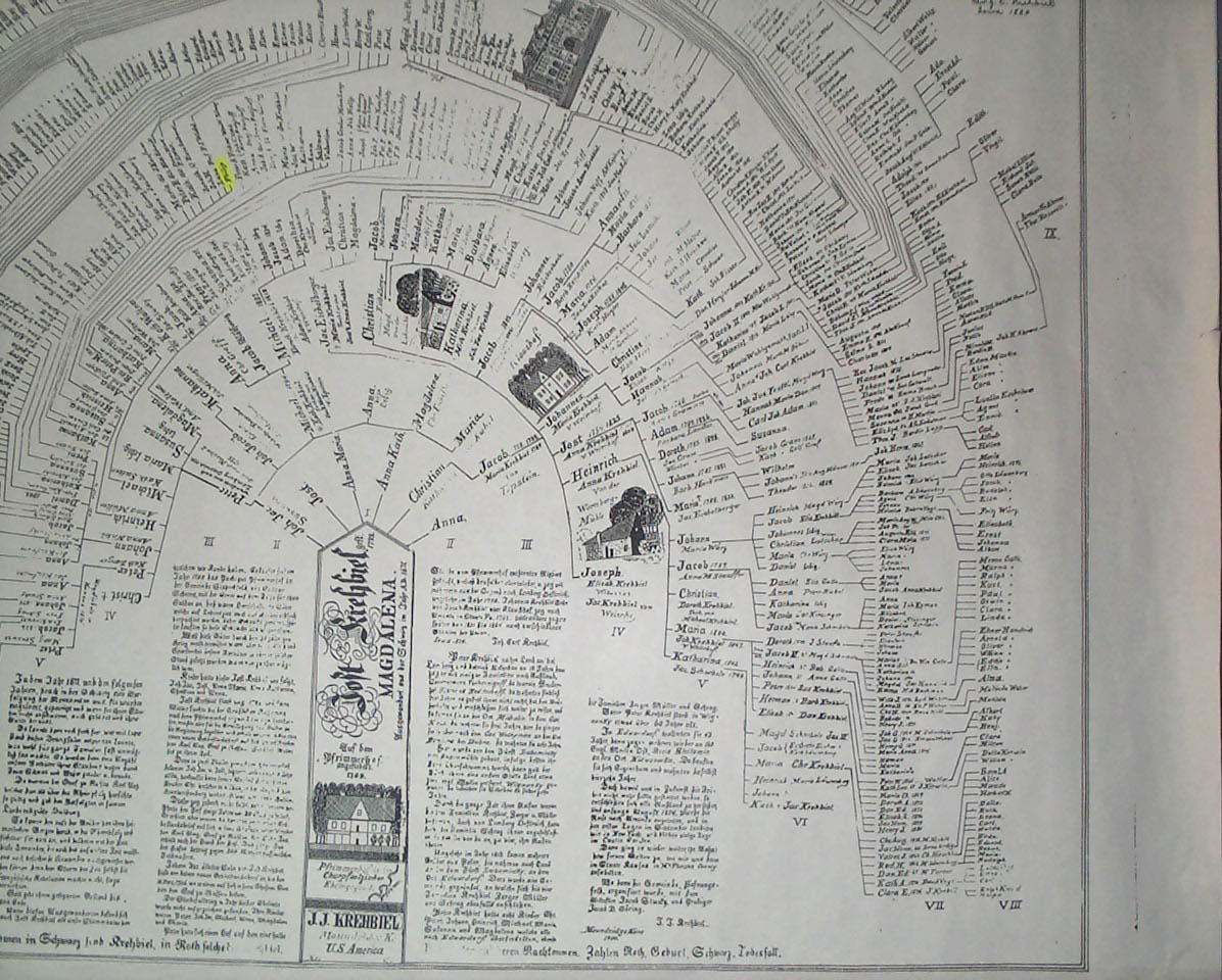 Jost Krehbiel Family Tree ChartThese 4 large pictures are overlapping pictures of a large wall chart. Mary Ritenour reports that this chart was created in 1900 by a J. J. Krehbiel from Moundridge Kansas which details 9 generations of descendants of this Jost Krehbiel (Mary's grandfather Phillip Krehbiel is in the sixth generation after Jost Krehbiel). While on a recent trip to Virginia to see my family, I was able to visit with Mary Ritenour (a fun morning with a very nice person, and I learned a lot about the branch of our family that migrated to Russia) and she allowed me to take pictures of the chart. I attempted to join the pictures into one big picture of the chart, but was unsuccessful because a couple of the pictures were not straight. So I've put all 4 pictures up so you could look at them and see if one is clearer than the other. Mary reports: I'm still trying to transcribe the chart information into Family Tree Maker. When I get that complete, I'll be happy to provide a GEDCOM file for your site. I estimate there are 300-400 names on this chart, and it ends with my grandfather's generation, so there is much to fill in, to bring it current. I've had news from John D. Thiesen, Archivist and